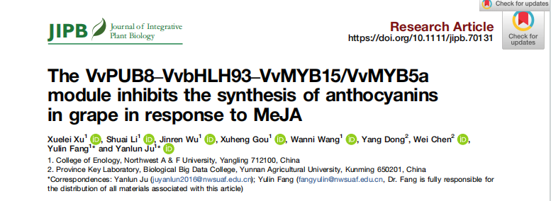 该研究系统解析了“VvPUB8-VvbHLH93-VvMYB15/VvMYB5a”模块响应MeJA信号调控葡萄果实花色苷合成的分子机理与调控网络。研究结果有助于揭示植物激素信号转导与色泽品质形成的交互调控机理,为改良葡萄色泽品质、优化栽培管理方案提供理论依据。