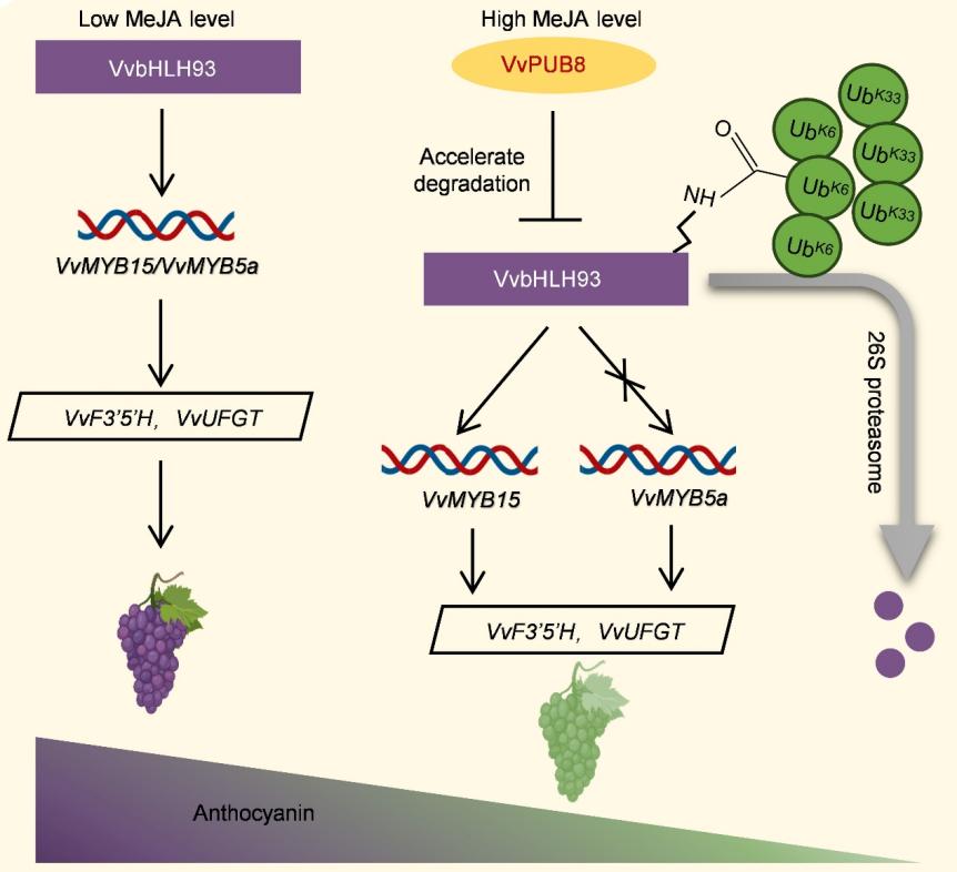 房玉林/鞠延仑团队题为“The VvPUB8-VvbHLH93-VvMYB15/VvMYB5a module inhibits the synthesis of anthocyanins in grape in response to the MeJA”的研究论文。文章揭示了在高浓度茉莉酸甲酯条件下,VvPUB8通过K6-和K33-泛素链泛素化修饰VvbHLH93,并加速VvbHLH93蛋白的降解,抑制花色苷合成相关基因的表达,从而抑制葡萄花色苷合成的分子机制(图1)。